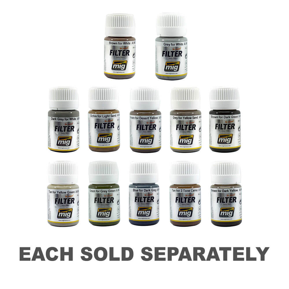 Filtr łatwy i gotowy do użycia bezpośrednio w modelu. Ten filtr jest specjalnie zaprojektowany do użytku na jasnych lub białych powierzchniach zimowych, takich jak zbiorniki, statki kosmiczne, jasne samoloty lub pojazdy Organizacji Narodów Zjednoczonych. Użyj filtrów, zwilżając pędzel i nakładając go bez zalewu powierzchni, aby wzbogacić odcienie w modele, zjednoczyć kamuflaż lub wyróżnij obszary o innym tonie. Dzięki tym produktom unikamy mieszania farb, szukania prawidłowego rozcieńczenia lub poszukiwania odpowiednich kolorów naszego pojazdu. Te filtry są oparte na szkliwach i mogą być czyszczone lub rozcieńczone bezwonną szkliwo.
