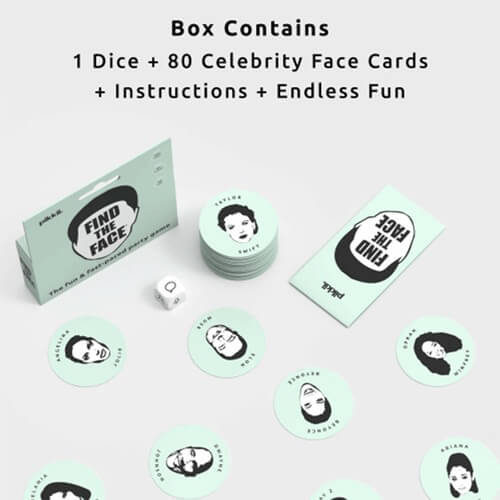 El juego divertido y rápido de encontrar las caras famosas primero. Incluye: 1 dados, 80 tarjetas de cara de celebridades, instrucciones y diversión sin fin.