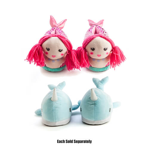 人魚やナルワルの中に足を右に入れて、人魚やナルワルっぽい履物を家の周りのサウンターにします...かわいいデザインは3次元で、糸の髪(もちろん人魚)や突き出た角のような甘いディテールを持っています(あなたが疑問に思っている場合に備えて、それはナルワルにあります!)。