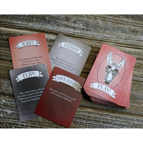 Som verten kan du tilpasse din uforglemmelige fest med tre blandbare oddAssity -dekk av stadig mer absurde utfordringer.