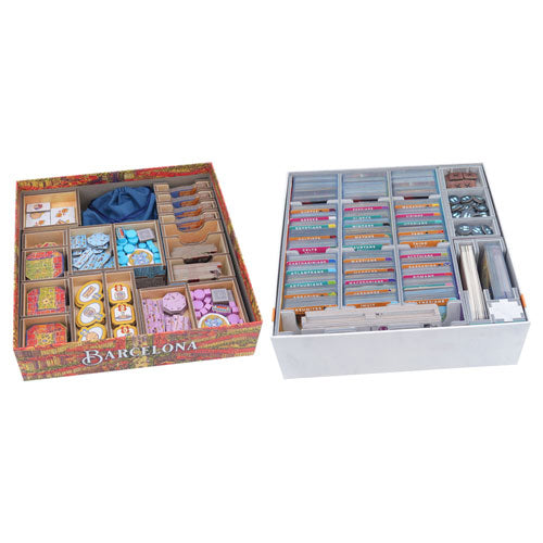 Insert compatible with Barcelona®, including the Passeig de Gràcia® expansion. The design provides both efficient storage and improved game play. Many of the trays can be utilised during the game, and they greatly aid set-up and clear-away times. The rules and boards act as a lid on top of the trays