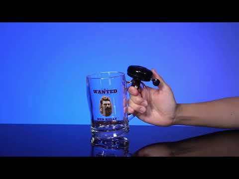Glassølkrus med en svart bjelle festet til håndtaket - ring den når det er tid for en ny drink! Funksjoner Aussie -ikonet Ned Kellys ønsket plakat. Perfekt for å holde glasset fullt til enhver tid!