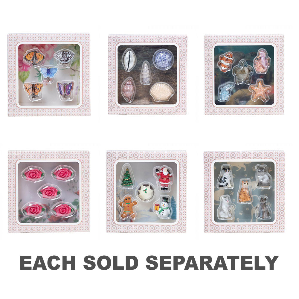 - Säljs i en uppsättning av 5 fjärilsdesigner (liten koppar, marmorerad vit, vanlig blå, komma och lila kejsare)